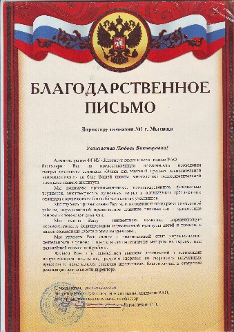 Благодарственное письмо директору Масловой Любови Викторовне за активное участие в подготовке и проведении мероприятий, посвященных